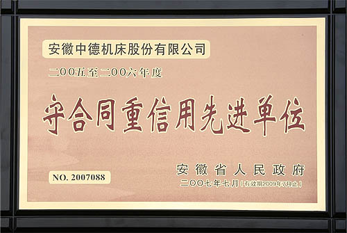 近日,安徽中德機床股份有限公司被安徽省人民政府授予2005-2006年度“守合同重信用先進單位”這一稱號。這也是我公司繼由馬鞍山市工商局、市人民政府、省工商局多次授予此類稱號后,再次獲得的更高級別的榮譽。